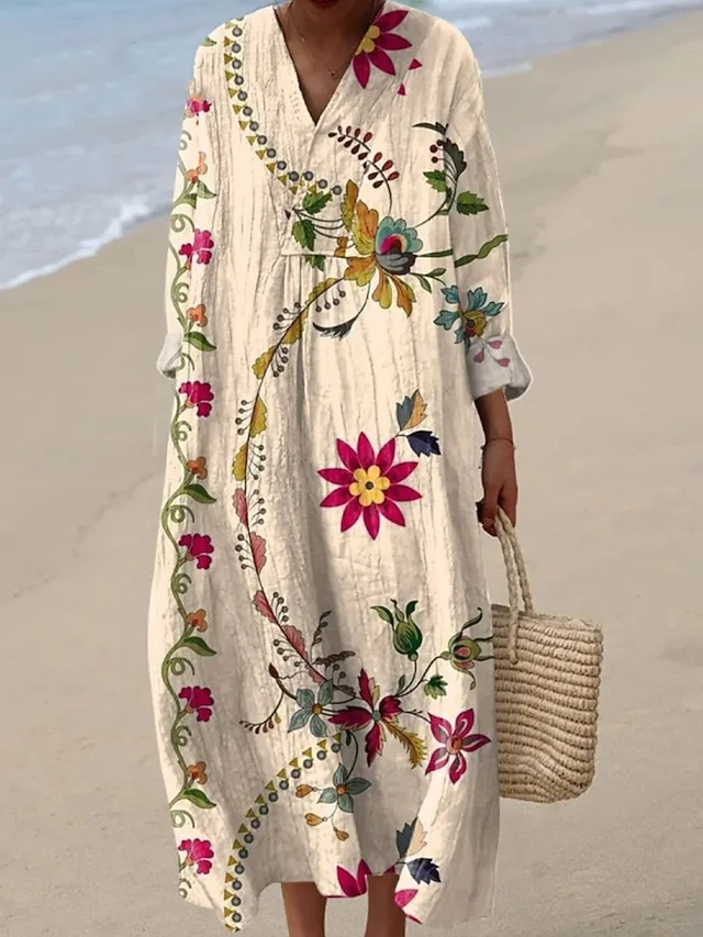 Luchtig bloemenmaxikleed met V-hals en lange mouwen. Elegant, comfortabel en veelzijdig voor de lente tot de herfst.