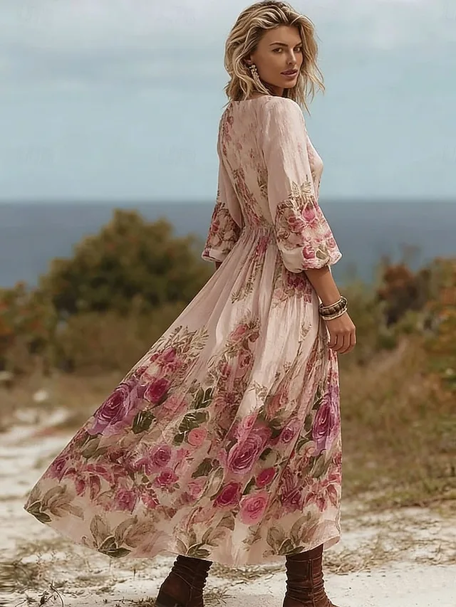 Luchtig bloemen-maxikleed met een losse pasvorm en driekwartmouwen. Perfect voor vakantie, strand en ontspannen looks. Ontdek het nu.