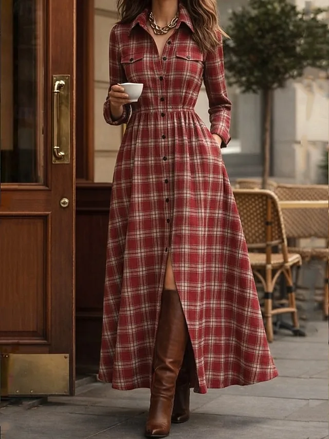 Deze maxijurk combineert moeiteloze casualheid met een elegante, ontspannen silhouet. Het klassieke ruitpatroon en de hemdenkraag geven de look een stijlvolle toets, die zowel geschikt is voor dagelijks gebruik als voor speciale vrijetijdsmomenten.