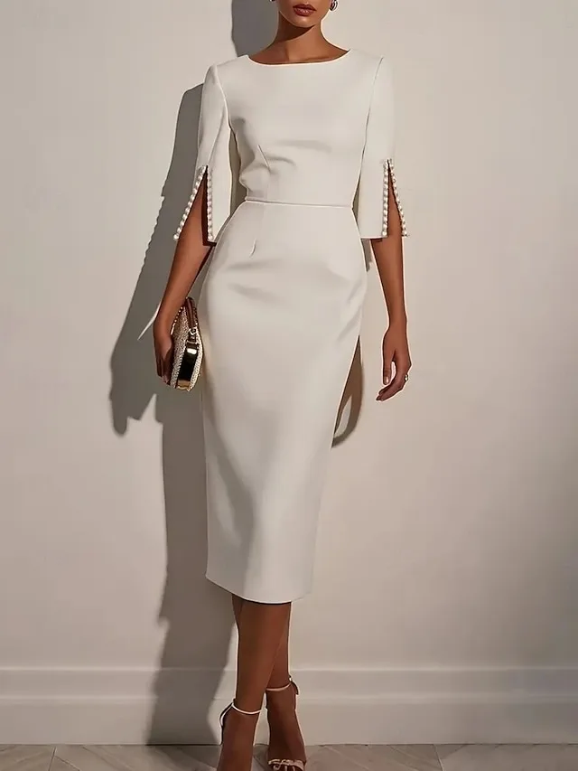 Het eenvoudige ontwerp is zowel chic als veelzijdig, terwijl de lange mouwen en de middellange lengte een tijdloze balans creëren. Een stijlvolle jurk voor veeleisende optredens in elk seizoen.