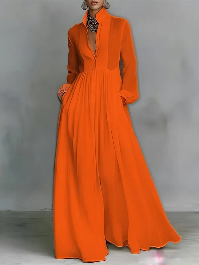 Dit elegante maxikleed combineert moderne verfijning met tijdloze bescheidenheid. De geplooide look en de hoge hals creëren een stijlvolle silhouet die zowel bij speciale gelegenheden als in het dagelijks leven zelfverzekerd overkomt.