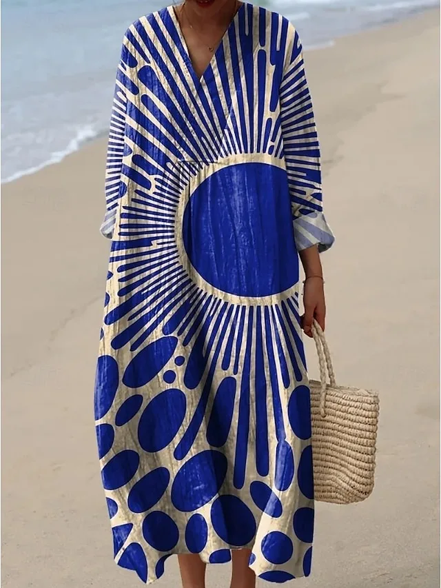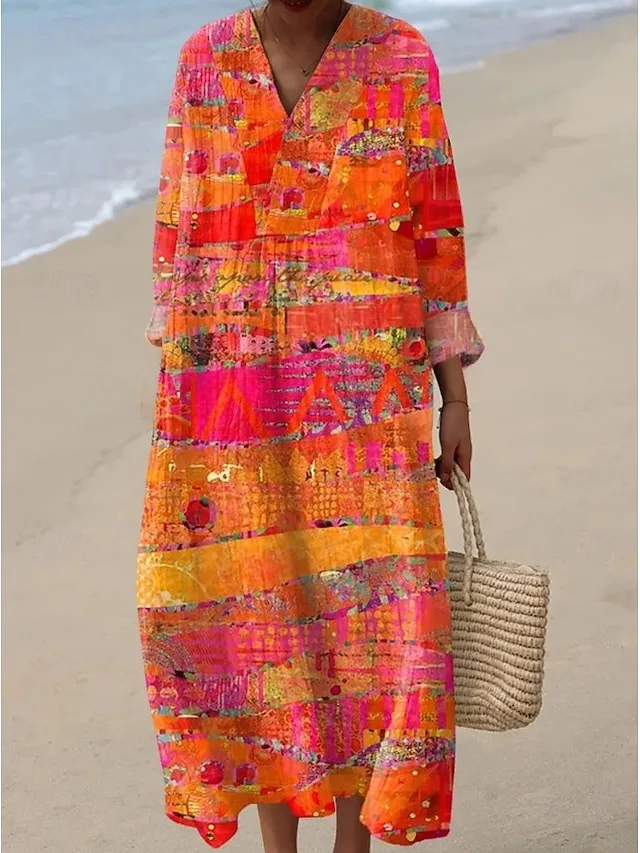 Deze midi-jurk combineert ontspannen elegantie met een expressieve, grafische uitstraling. De vloeiende silhouet en de V-hals geven het ontwerp een moeiteloos stijlvolle uitstraling – ideaal voor zonnige dagen, speciale gelegenheden en een moderne Boho-look.