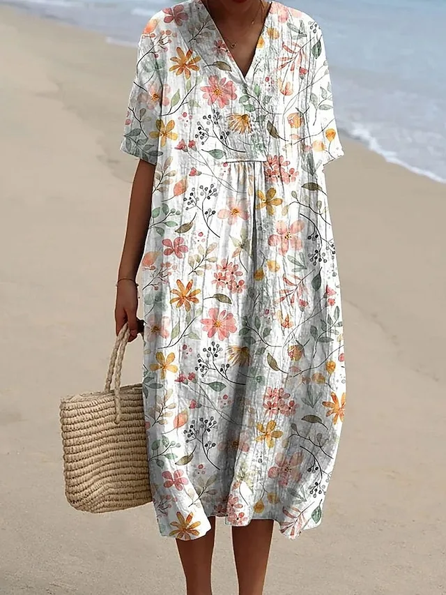 Licht, ontspannen en moeiteloos stijlvol: Deze midi-jurk brengt zomerse lichtheid in uw garderobe. De vloeiende snit en het charmante bloemen- en grafische ontwerp geven de look een elegante, tegelijkertijd casual uitstraling.