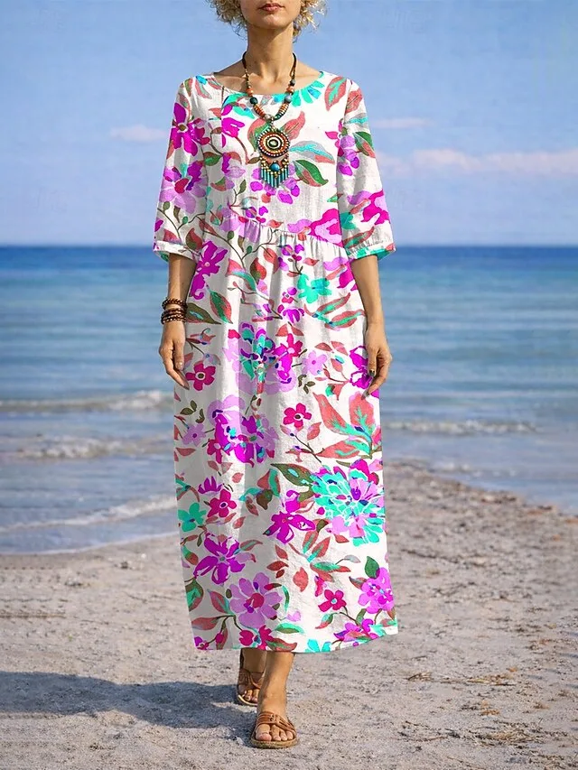 Dit maxikleed verenigt moeiteloze elegantie met een ontspannen vakantiegevoel. De losse snit, het opvallende bloemen-grafiekontwerp en de vloeiende silhouet maken het een stijlvolle metgezel voor zonnige dagen en bijzondere momenten.