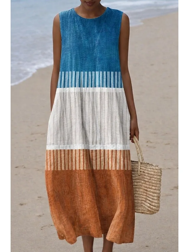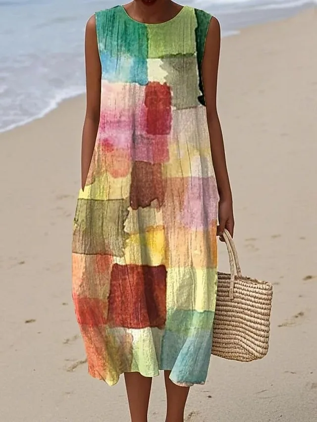 Lässig Locker Bloemen Ronde Hals Mouwloos Midi Jurk
