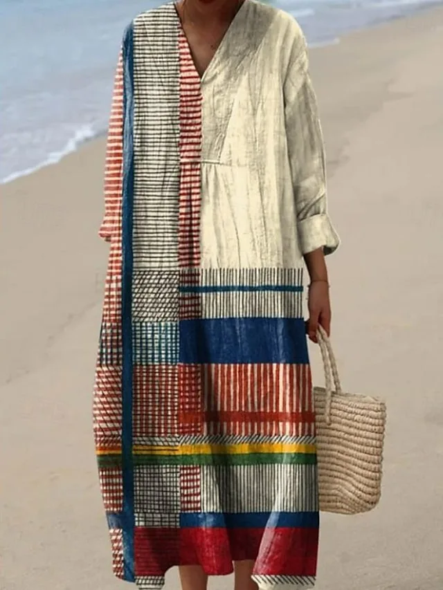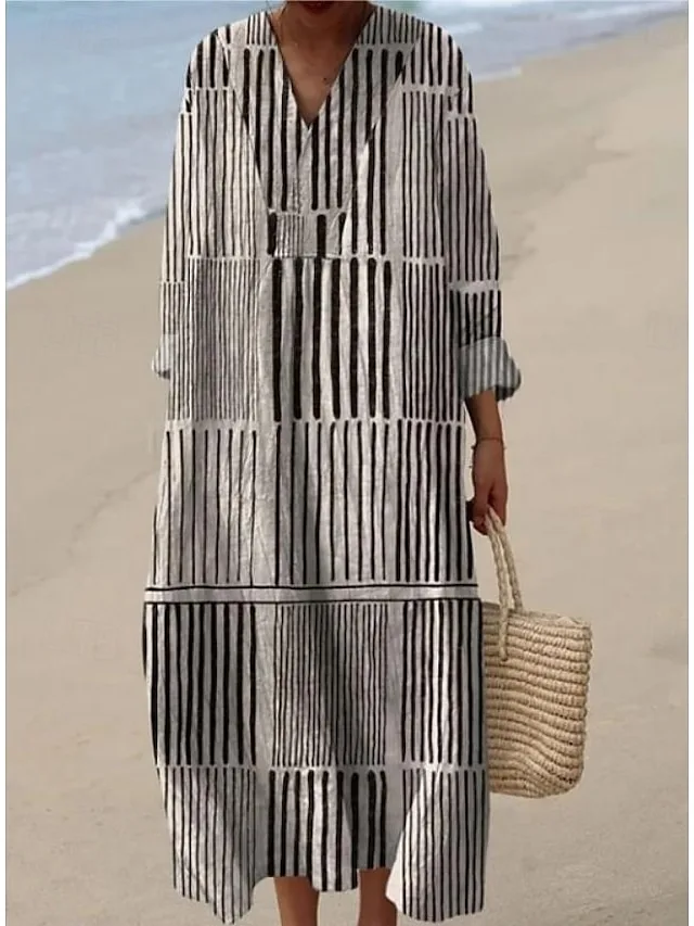 Ontdek de casual midi-jurk met grafische print en V-hals – perfect voor vakantie, strand en stijlvolle uitjes.