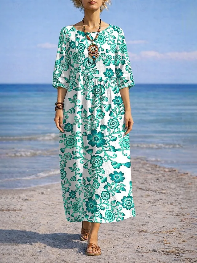 Dit maxikleed verenigt moeiteloze elegantie met een ontspannen vakantiegevoel. De vloeiende snit en het expressieve bloemen-grafiekpatroon geven uw look een vrouwelijke, stijlvolle toets voor zonnige dagen en speciale momenten.
