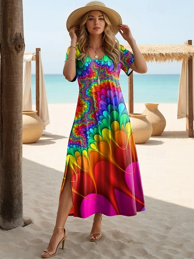 Dit midikleed combineert zomerse lichtheid met een expressieve, kleurrijke print. De A-lijn en de comfortabele snit zorgen voor een elegante silhouet met een ontspannen draaggevoel – ideaal voor vakantie, wandelingen of stijlvolle vrijetijdsmomenten.