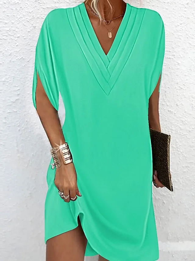 Dit minikleed verenigt moeiteloze casualheid met een vrouwelijke silhouet en een moderne print die elke verschijning een stijlvolle touch geeft. De V-hals en vleermuismouwen zorgen voor een ontspannen, maar tegelijkertijd elegante uitstraling – ideaal voor werk en dagelijks gebruik.